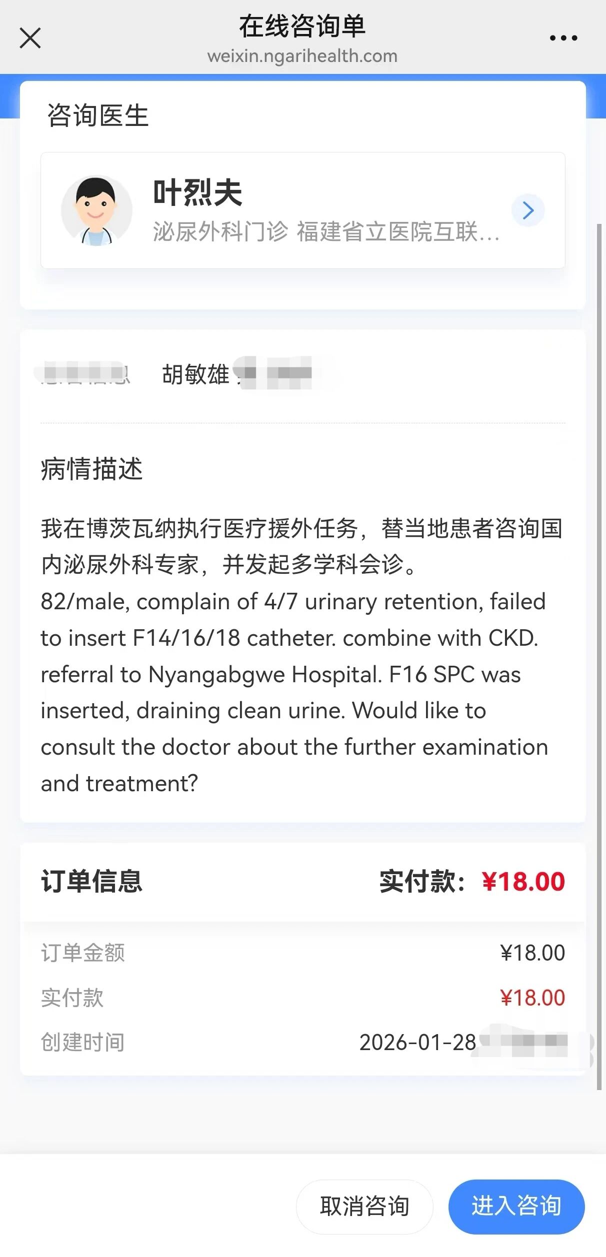 我院院长陈刚教授及仰加圭转诊医院院长Dr.Kgetse共同参与了此次跨境MDT会诊,双方围绕相关专科在两国医疗体系中的发展路径差异与临床实践特色,展开了深入探讨与交流。中国第17批援博茨瓦纳医疗队副队长、我院泌尿外科胡敏雄医师在仰加圭转诊医院主持了此次会诊,泌尿外科主任叶烈夫,副主任朱庆国、吴进锋以及放射科罗敏主任医师等在福州参加会诊。此前,在发起本次互联网医院会诊的过程中,胡敏雄医师还主动替非洲病友通过腾讯微信缴纳了18元人民币的互联网诊疗费——这一以人民币完成跨境支付的举动,成为人民币国际化在医疗场景中的生动注脚。