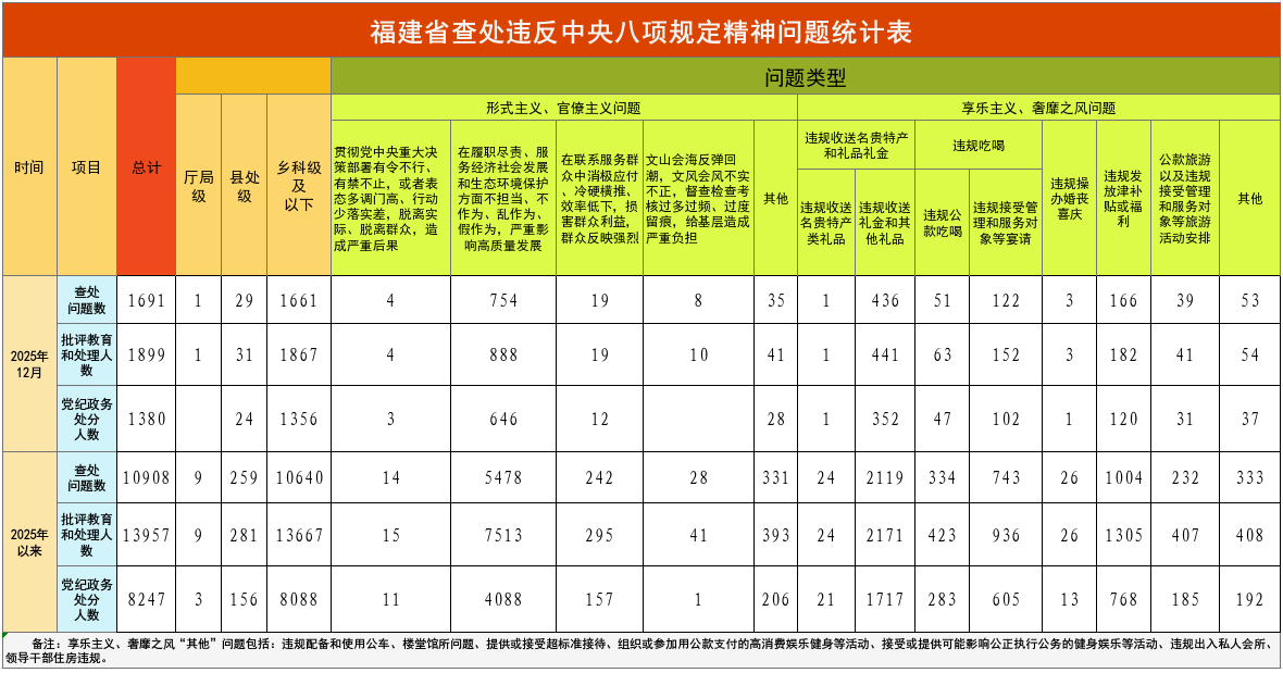 2025年12月,福建省查处违反中央八项规定精神问题1691件,批评教育和处理1899人,给予党纪政务处分1380人。福建省2025年以来查处违反中央八项规定精神情况如下: