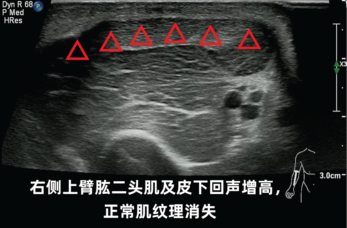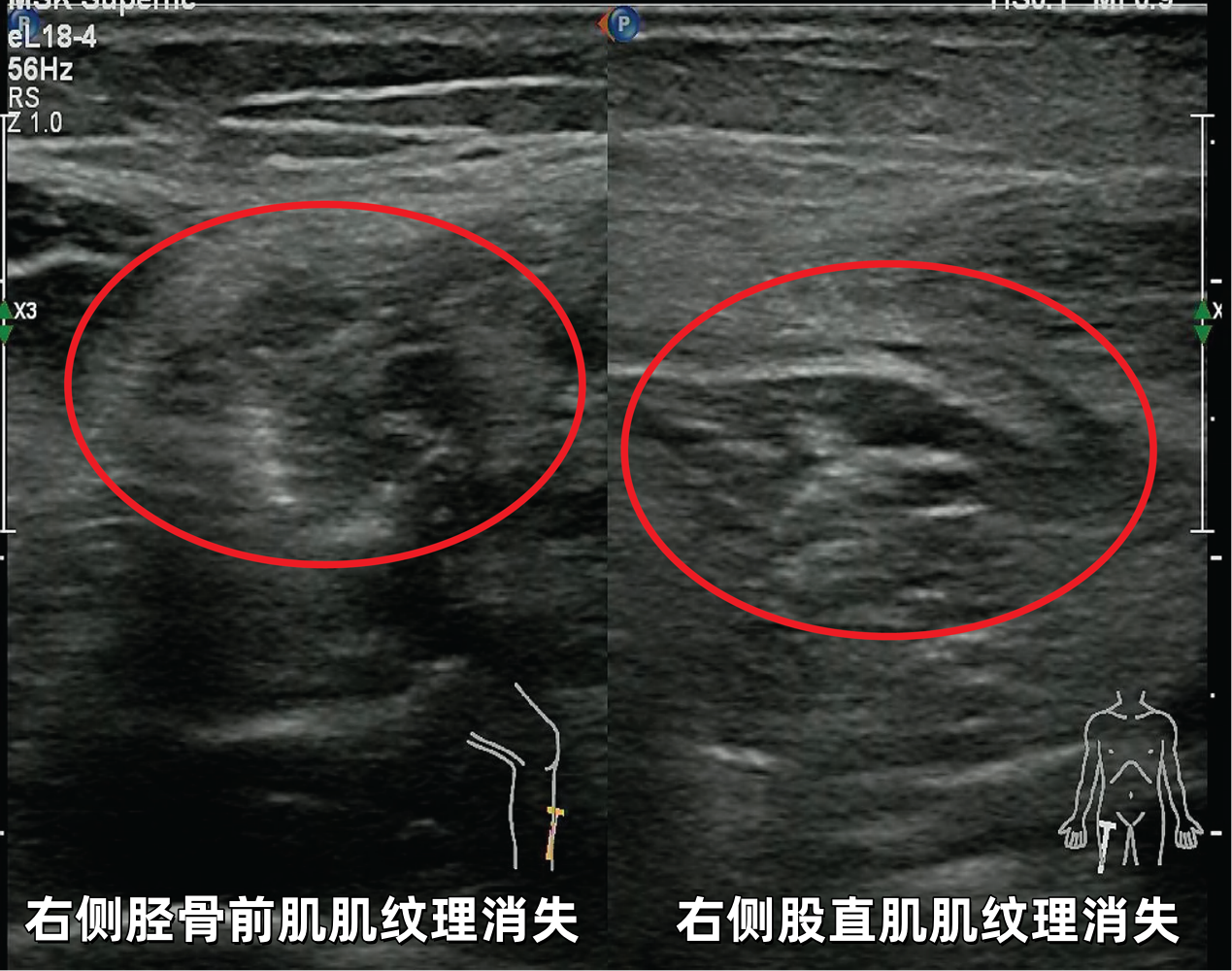 当超声探头滑过小轩疼痛无力的四肢时,屏幕上的图像揭示了关键线索:其双臂及大腿的肌肉呈现出特征性的纹理紊乱、结构模糊。